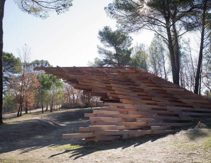 구마 켄고가 2018년 만든 <코모레비(Komorebi)>는 '나무 사이로 빛의 광선이 어떻게 스며들는지'를 표현하는 일본어에서 따온 제목이 붙었습니다. 그는 프랑스 남부의 생빅투아르가 내려다보이는 언덕에 나무처럼 유기적인 파빌리온을 만들었죠. '브라질 호두'라고도 알려진 조밀한 남미 목재인 이페 239개를 스테인리스 스틸이 지지하는 복잡한 구조로 만들어졌는데요. 켄고는 "세잔이 생빅투아르를 그리는 방식으로 나무를 추상화하려고 시도했다"고 설명합니다.