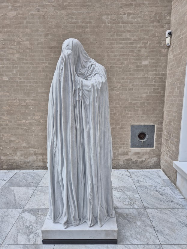 두 명의 인간 형상이 거대한 천(드레이퍼리)에 의해 완전히 덮여 한 몸처럼 조각되어 있습니다. 이는 죽음이 지닌 '신비로움'과 '침묵'을 시각화한 것이죠. 순백의 대리석을 재료로 사용했지만 죽음과 부패를 주제로 삼아 미와 소멸의 조각을 완성했습니다. 멀리서보면 텅빈 껍데기처럼 보여 마치 '미술관의 유령' 같은 존재감을 드러냅니다.