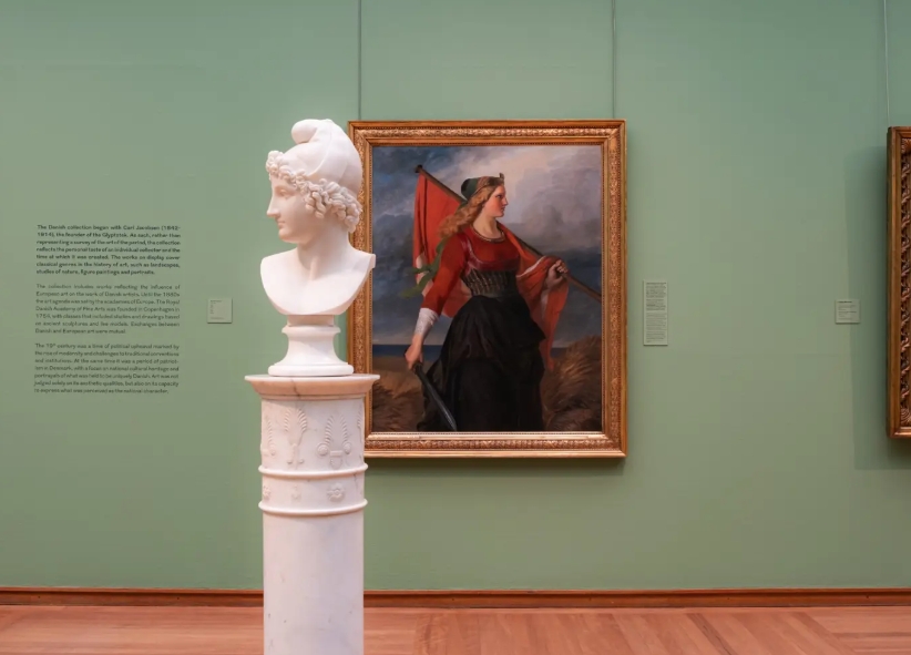 전시실에 들어서자마자 만날 수 있는 안토니오 카노바의 <파리스 흉상>과 엘리자베스 예리하우-바우만(Elisabeth Jerichau-Baumann)의 회화 <어머니 덴마크(Mother Denmark)>의 조화가 인상적이었습니다. 1851년에 그려진 이 그림은 덴마크를 의인화한 여성상으로 유명합니다. 스칸디나비아 전통 의상을 입은 금발의 여성이 고대 검을 들고 보리밭을 가로지르는 모습으로 묘사되고 있죠. 덴마크의 국가적 정체성과 낭만주의 시대의 이상을 반영하는 상징적인 작품입니다.