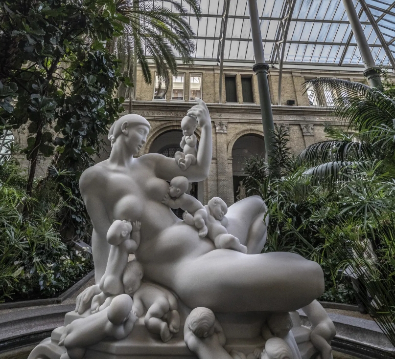 야자수와 카이 닐슨의 조각 <물의 어머니>가 있는 겨울 정원이 장식하는 미술관의 입구는 창립자가 "평범한 박물관이 아니라 코펜하겐 사람들을 위한 오아시스"로 만들기 위한 고안으로 탄생했습니다. 그래서 박물관이라는 단어 대신 그리스어 glyptos(조각 또는 조각)에서 유래한 'Glyptotek'이라 불렀고, theke는 무언가를 수집하거나 전시하는 장소를 뜻합니다.
