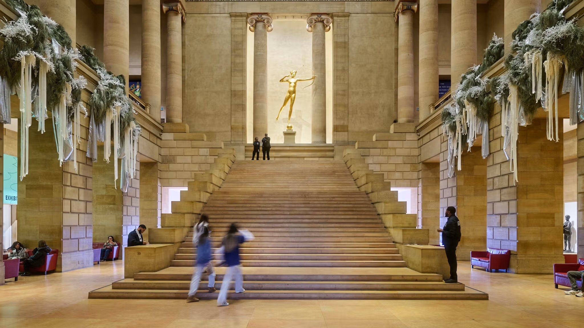 2층으로 오르는 계단 앞에서 서면 압도되는 광경을 목격하게 됩니다. 아테네 파르테논 신전을 연상케하는 기둥이 도열해 있고, 꽤나 높은 2층으로 오르는 계단 끝에 금빛으로 반짝이는 조각이 보입니다. 그레이트 스테어홀의 주인공 다이애나 조각입니다. 미국 조각가 어거스터스 생고든의 가장 잘 알려진 작품이죠.
